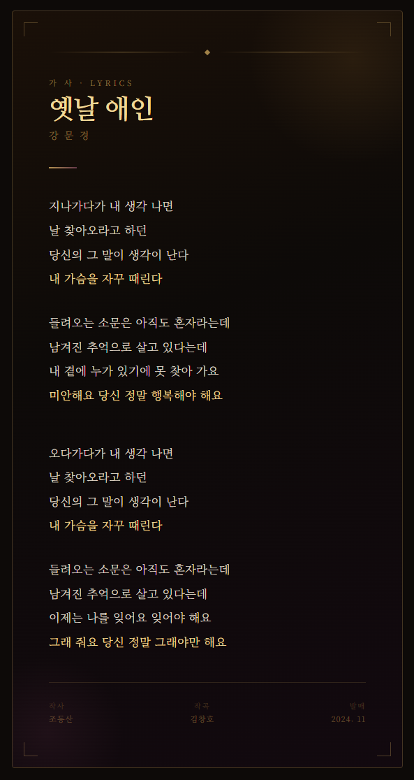 잊지 못하는 옛사랑을 그리워하면서도 "이제는 나를 잊어요, 잊어야 해요"라며 스스로를 다독이는 내용으로, 그리움과 이별의 감정을 담담하게 풀어낸 곡입니다. 예선 무대 영상은 현재 1,100만 회 이상의 조회수를 기록하며 강문경의 이름을 대중에게 각인시킨 결정적인 무대로 평가받고 있습니다.